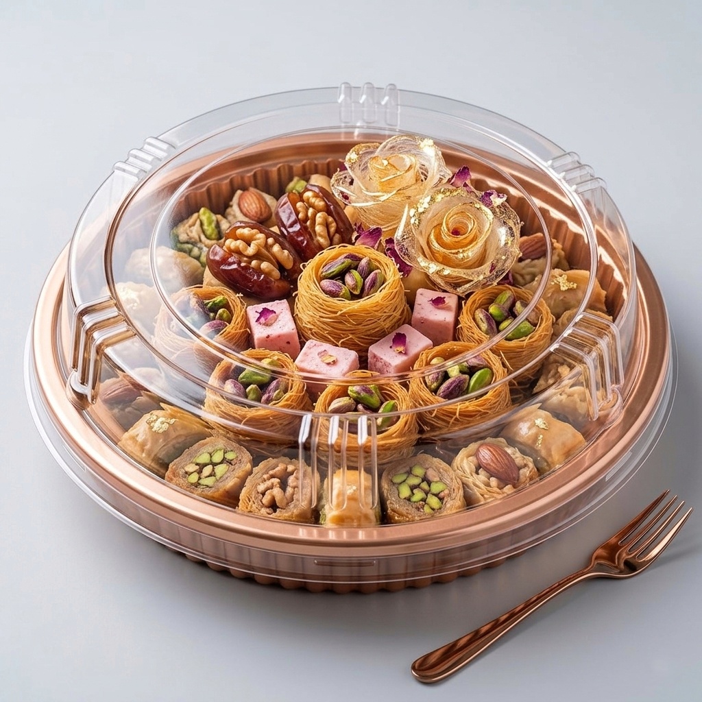 علب بلاستيكية دائرية بغطاء شفاف مثالية لتقديم السوشي أو الحلويات.