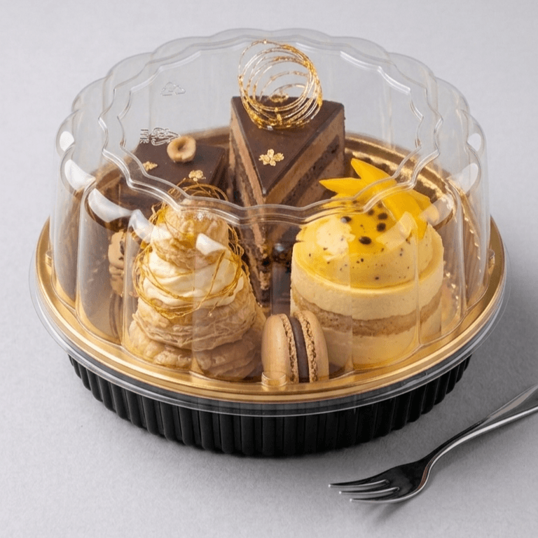 علب بلاستيكية ذهبية بشكل دائري وانيق وغطاء شفاف مرتفع لتقديم السوشي أو الحلويات.